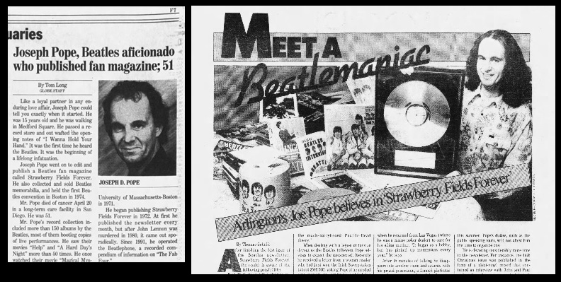 ←写真 左は1999年6月3日付のボストン・グローブ紙、Pope氏の訃報を伝えた。右は1979年3月15日付の同紙、Joe Pope 氏並びにファン・クラブ「Strawberry Fields Forever」の特集記事が掲載された。