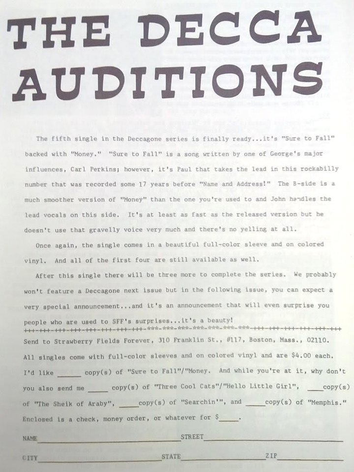 SFF(Strawberry Fields Forever) ニューズ・レターNo.29(1978年夏発送)に同梱された「SURE TO FALL / MONEY」のオーダー・シート。既に販売されている4枚のタイトルもオーダーできるようになっている(写真下方)。
