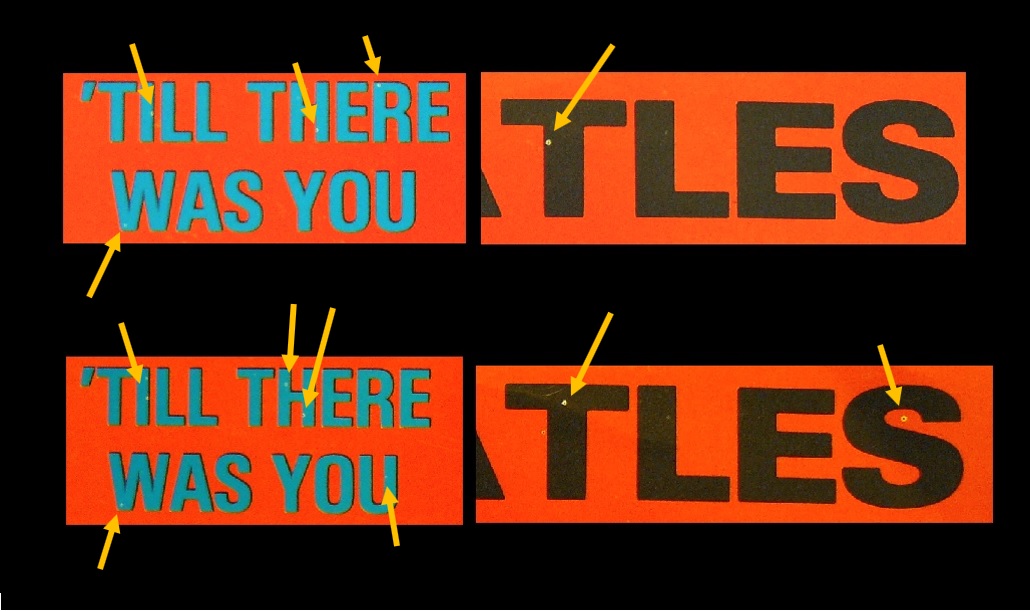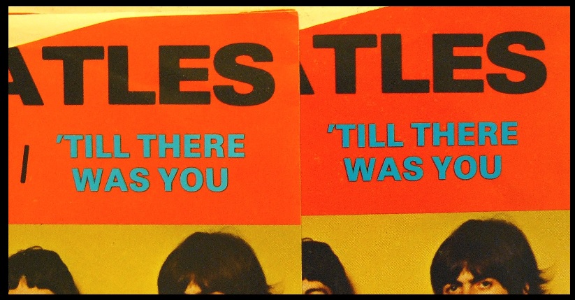上になっている左側のスリーブがDgn 47のもの、下になっている右のスリーブはDgn53である。「'TILL THERE WAS YOU」文字のブルーが左はやや薄いライト・ブルーだが、右側の方はやや濃いブルーなっている。さらによく見るとバックのレッドも左側の方がややオレンジで、右は色がほぼレッド、そのため「'TILL THERE WAS YOU」のブルーのコントラストにも違いが生じていると思われる。