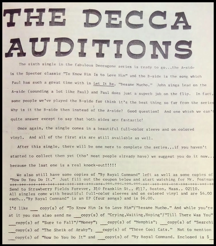 Deccagoneシングル・シリーズの7枚目となる「To Know Her Is To Love Her / Besame Mucho(PRO-1106)」 は、年を越して1979年の2月に発送されたSFFNo.31にオーダー・シートが同梱される形で発売された。